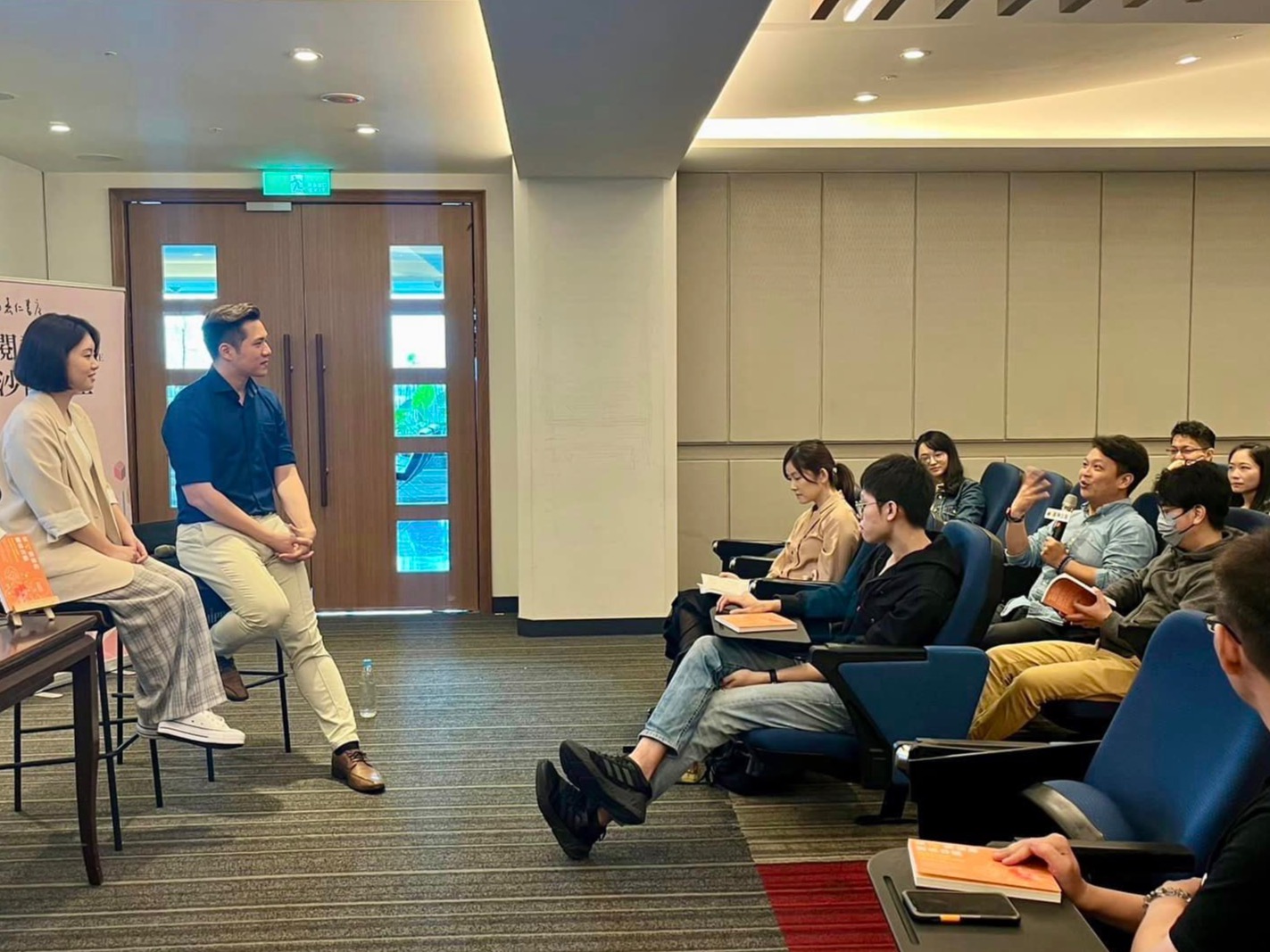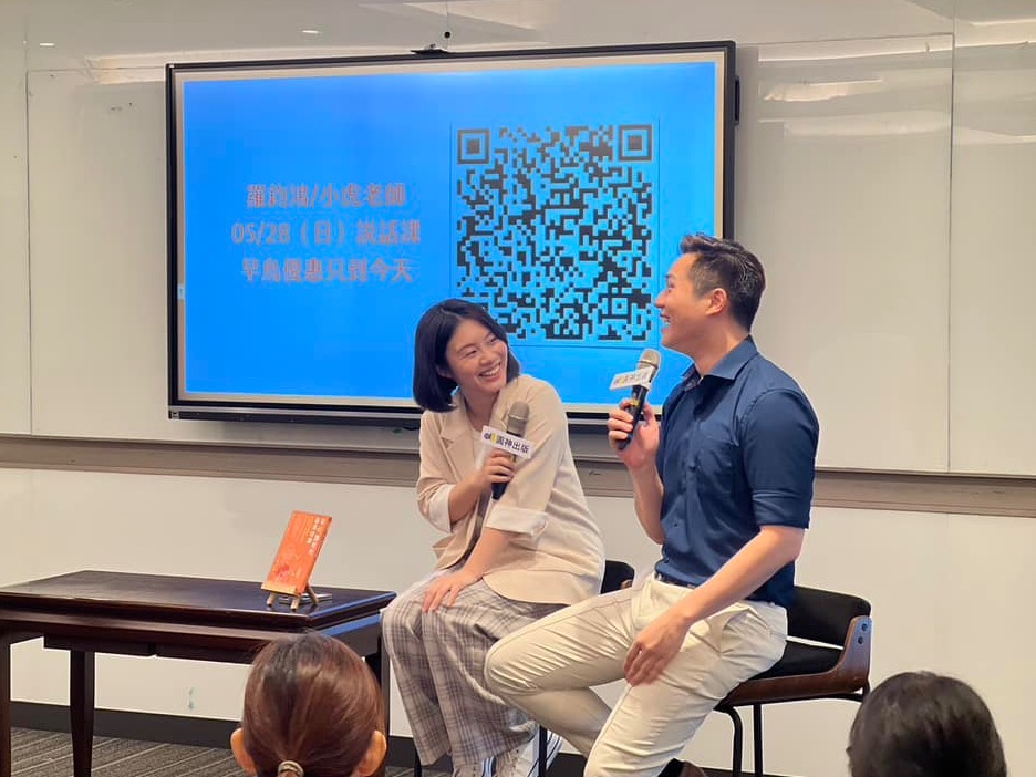 這份愛也延續到了今天會場,在很自然又互相吐槽的氣氛中,我和小虎回答了雅雯的提問,也透過現場演繹(?)和大家分享:如何培養翻譯「氣話」的能力,以及挑戰在三十秒說出自己的十個優點,這些書中提到和伴侶、和朋友、和自己的相處方式,不是一套人際相處的標準答案,是我們在日常中的看見與學會,希望藉由我們的親身經歷,和你一起走過肯定自己的這條路。